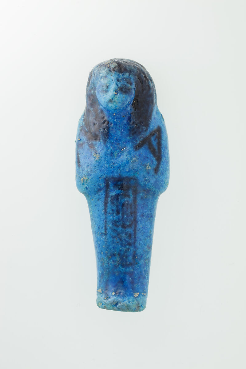 Almost 400 small funerary figures known as shabtis were found with Nauny’s burial. These can be seen as avatars, meant to carry out agricultural labor on Nauny’s behalf in the afterlife. Of the 393 shabtis discovered, 355 were workers like this one, and 37 were overseers (see for example <a href="https://www.metmuseum.org/art/collection/search/551114">30.3.28.3</a>). Based on other assemblages from this era, Nauny originally might have had a total of 365 workers, one for each day of the year. This mummiform figure holds a hoe in each hand and has a basket on its back. The inscription on the front of the body calls Nauny an “illuminated Osiris.” This indicated that she had been transformed through the process of mummification and identified with the principal god of the dead, then reanimated by the light of the sun god as he traveled through the Netherworld each night. Nauny’s shabtis were divided between seven boxes. Five of these, with their shabtis, were given to The Met, while two were sent to the Egyptian Museum in Cairo.