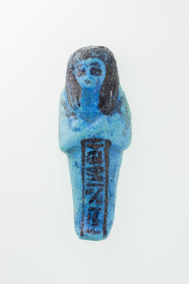 Almost 400 small funerary figures known as shabtis were found with Nauny’s burial. These can be seen as avatars, meant to carry out agricultural labor on Nauny’s behalf in the afterlife. Of the 393 shabtis discovered, 355 were workers like this one, and 37 were overseers (see for example <a href="https://www.metmuseum.org/art/collection/search/551114">30.3.28.3</a>). Based on other assemblages from this era, Nauny originally might have had a total of 365 workers, one for each day of the year. This mummiform figure holds a hoe in each hand and has a basket on its back. The inscription on the front of the body calls Nauny an “illuminated Osiris.” This indicated that she had been transformed through the process of mummification and identified with the principal god of the dead, then reanimated by the light of the sun god as he traveled through the Netherworld each night. Nauny’s shabtis were divided between seven boxes. Five of these, with their shabtis, were given to The Met, while two were sent to the Egyptian Museum in Cairo.
