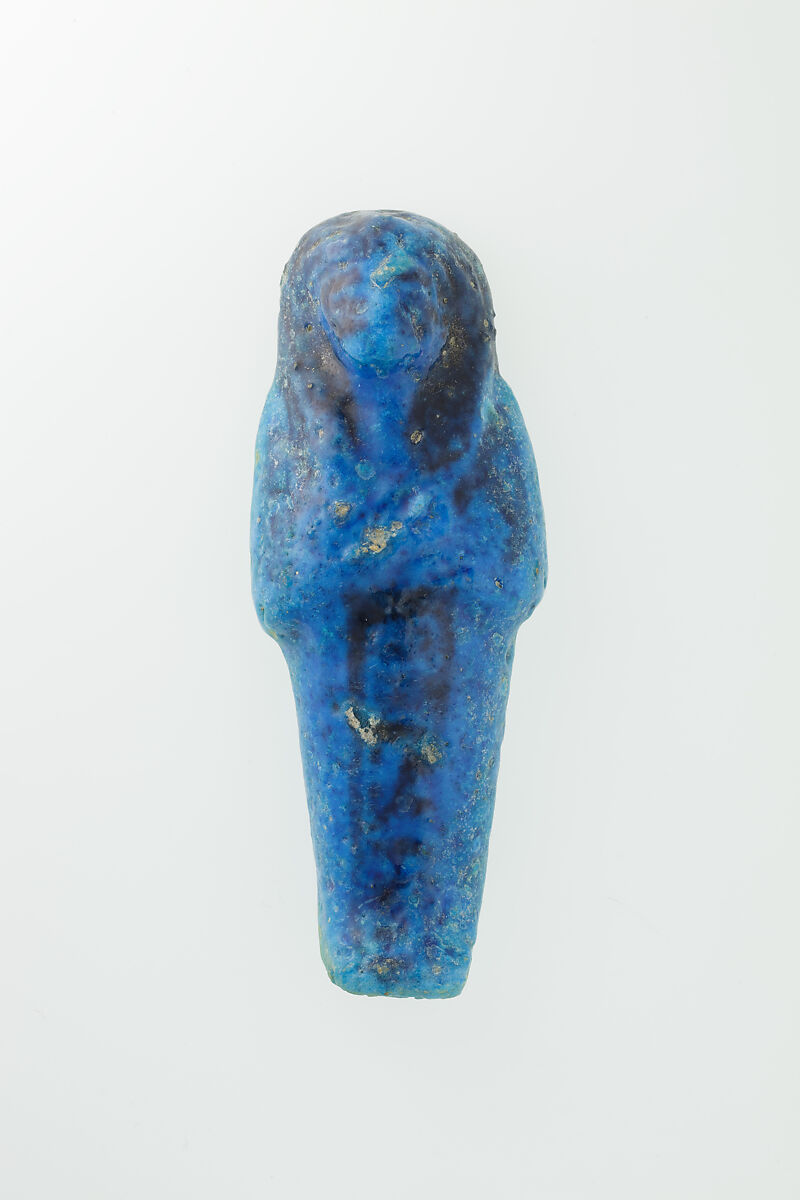 Almost 400 small funerary figures known as shabtis were found with Nauny’s burial. These can be seen as avatars, meant to carry out agricultural labor on Nauny’s behalf in the afterlife. Of the 393 shabtis discovered, 355 were workers like this one, and 37 were overseers (see for example <a href="https://www.metmuseum.org/art/collection/search/551114">30.3.28.3</a>). Based on other assemblages from this era, Nauny originally might have had a total of 365 workers, one for each day of the year. This mummiform figure holds a hoe in each hand and has a basket on its back. The inscription on the front of the body reads, "the Osiris Nauny, true of voice." This indicated that Nauny had been transformed through the process of mummification and identified with the principal god of the dead, and then had been judged to have led an ethical life. Nauny’s shabtis were divided between seven boxes. Five of these, with their shabtis, were given to The Met, while two were sent to the Egyptian Museum in Cairo.
