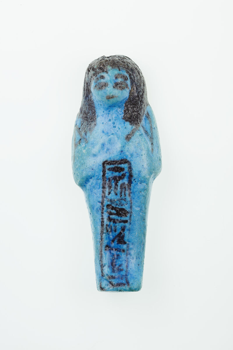 Almost 400 small funerary figures known as shabtis were found with Nauny’s burial. These can be seen as avatars, meant to carry out agricultural labor on Nauny’s behalf in the afterlife. Of the 393 shabtis discovered, 355 were workers like this one, and 37 were overseers (see for example <a href="https://www.metmuseum.org/art/collection/search/551114">30.3.28.3</a>). Based on other assemblages from this era, Nauny originally might have had a total of 365 workers, one for each day of the year. This mummiform figure holds a hoe in each hand and has a basket on its back. The inscription on the front of the body calls Nauny an “illuminated Osiris.” This indicated that she had been transformed through the process of mummification and identified with the principal god of the dead, then reanimated by the light of the sun god as he traveled through the Netherworld each night. Nauny’s shabtis were divided between seven boxes. Five of these, with their shabtis, were given to The Met, while two were sent to the Egyptian Museum in Cairo.