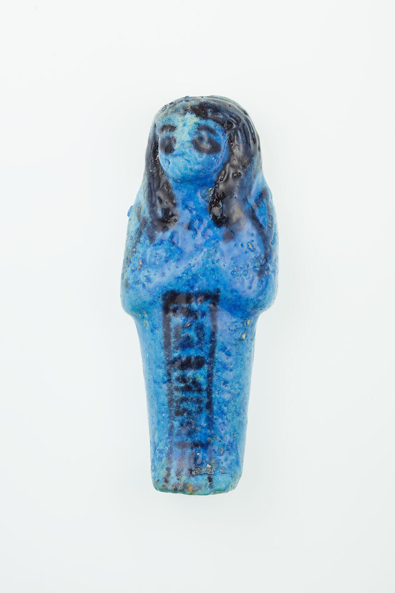 Almost 400 small funerary figures known as shabtis were found with Nauny’s burial. These can be seen as avatars, meant to carry out agricultural labor on Nauny’s behalf in the afterlife. Of the 393 shabtis discovered, 355 were workers like this one, and 37 were overseers (see for example <a href="https://www.metmuseum.org/art/collection/search/551114">30.3.28.3</a>). Based on other assemblages from this era, Nauny originally might have had a total of 365 workers, one for each day of the year. This mummiform figure holds a hoe in each hand and has a basket on its back. The inscription on the front of the body calls Nauny an “illuminated Osiris.” This indicated that she had been transformed through the process of mummification and identified with the principal god of the dead, then reanimated by the light of the sun god as he traveled through the Netherworld each night. Nauny’s shabtis were divided between seven boxes. Five of these, with their shabtis, were given to The Met, while two were sent to the Egyptian Museum in Cairo.