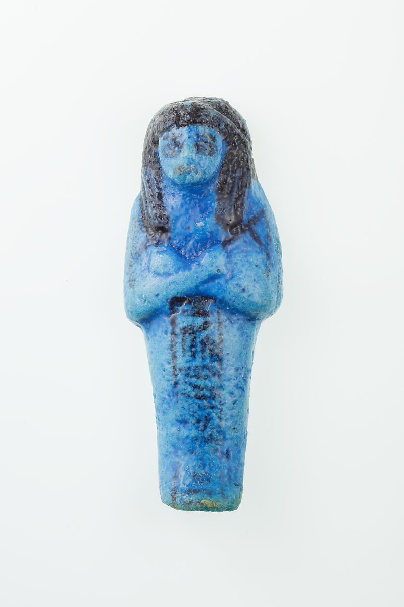Almost 400 small funerary figures known as shabtis were found with Nauny’s burial. These can be seen as avatars, meant to carry out agricultural labor on Nauny’s behalf in the afterlife. Of the 393 shabtis discovered, 355 were workers like this one, and 37 were overseers (see for example <a href="https://www.metmuseum.org/art/collection/search/551114">30.3.28.3</a>). Based on other assemblages from this era, Nauny originally might have had a total of 365 workers, one for each day of the year. This mummiform figure holds a hoe in each hand and has a basket on its back. The inscription on the front of the body calls Nauny an “illuminated Osiris.” This indicated that she had been transformed through the process of mummification and identified with the principal god of the dead, then reanimated by the light of the sun god as he traveled through the Netherworld each night. Nauny’s shabtis were divided between seven boxes. Five of these, with their shabtis, were given to The Met, while two were sent to the Egyptian Museum in Cairo.