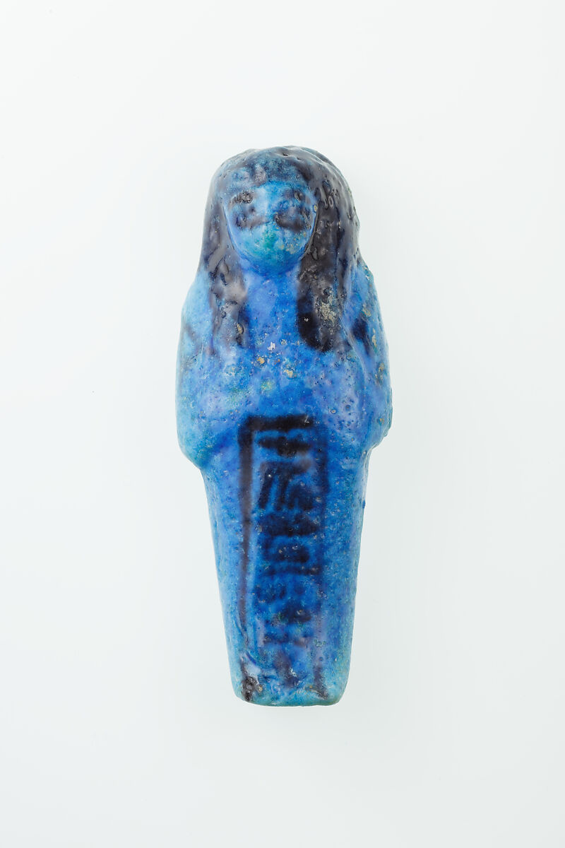 Almost 400 small funerary figures known as shabtis were found with Nauny’s burial. These can be seen as avatars, meant to carry out agricultural labor on Nauny’s behalf in the afterlife. Of the 393 shabtis discovered, 355 were workers like this one, and 37 were overseers (see for example <a href="https://www.metmuseum.org/art/collection/search/551114">30.3.28.3</a>). Based on other assemblages from this era, Nauny originally might have had a total of 365 workers, one for each day of the year. This mummiform figure holds a hoe in each hand and has a basket on its back. The inscription on the front of the body calls Nauny an “illuminated Osiris.” This indicated that she had been transformed through the process of mummification and identified with the principal god of the dead, then reanimated by the light of the sun god as he traveled through the Netherworld each night. Nauny’s shabtis were divided between seven boxes. Five of these, with their shabtis, were given to The Met, while two were sent to the Egyptian Museum in Cairo.