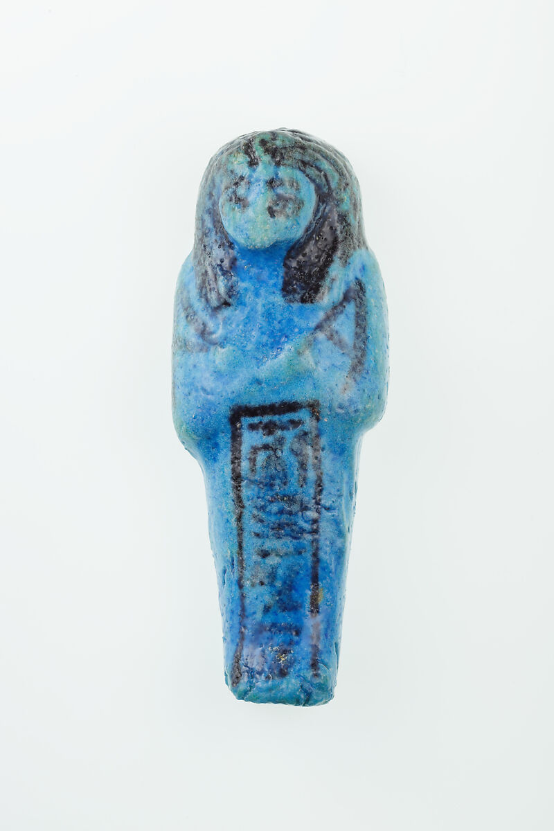 Almost 400 small funerary figures known as shabtis were found with Nauny’s burial. These can be seen as avatars, meant to carry out agricultural labor on Nauny’s behalf in the afterlife. Of the 393 shabtis discovered, 355 were workers like this one, and 37 were overseers (see for example <a href="https://www.metmuseum.org/art/collection/search/551114">30.3.28.3</a>). Based on other assemblages from this era, Nauny originally might have had a total of 365 workers, one for each day of the year. This mummiform figure holds a hoe in each hand and has a basket on its back. The inscription on the front of the body calls Nauny an “illuminated Osiris.” This indicated that she had been transformed through the process of mummification and identified with the principal god of the dead, then reanimated by the light of the sun god as he traveled through the Netherworld each night. Nauny’s shabtis were divided between seven boxes. Five of these, with their shabtis, were given to The Met, while two were sent to the Egyptian Museum in Cairo.