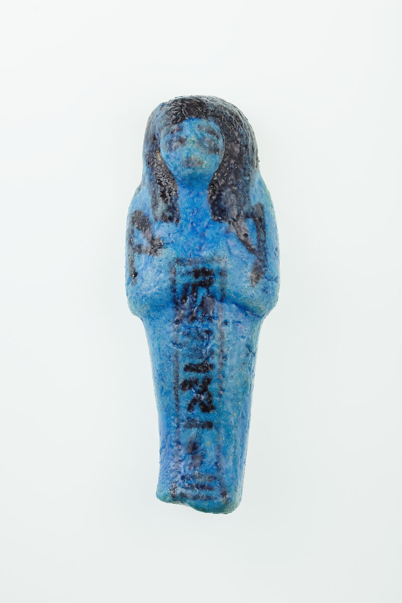 Almost 400 small funerary figures known as shabtis were found with Nauny’s burial. These can be seen as avatars, meant to carry out agricultural labor on Nauny’s behalf in the afterlife. Of the 393 shabtis discovered, 355 were workers like this one, and 37 were overseers (see for example <a href="https://www.metmuseum.org/art/collection/search/551114">30.3.28.3</a>). Based on other assemblages from this era, Nauny originally might have had a total of 365 workers, one for each day of the year. This mummiform figure holds a hoe in each hand and has a basket on its back. The inscription on the front of the body reads, "the Osiris Nauny, true of voice." This indicated that Nauny had been transformed through the process of mummification and identified with the principal god of the dead, and then had been judged to have led an ethical life. Nauny’s shabtis were divided between seven boxes. Five of these, with their shabtis, were given to The Met, while two were sent to the Egyptian Museum in Cairo.
