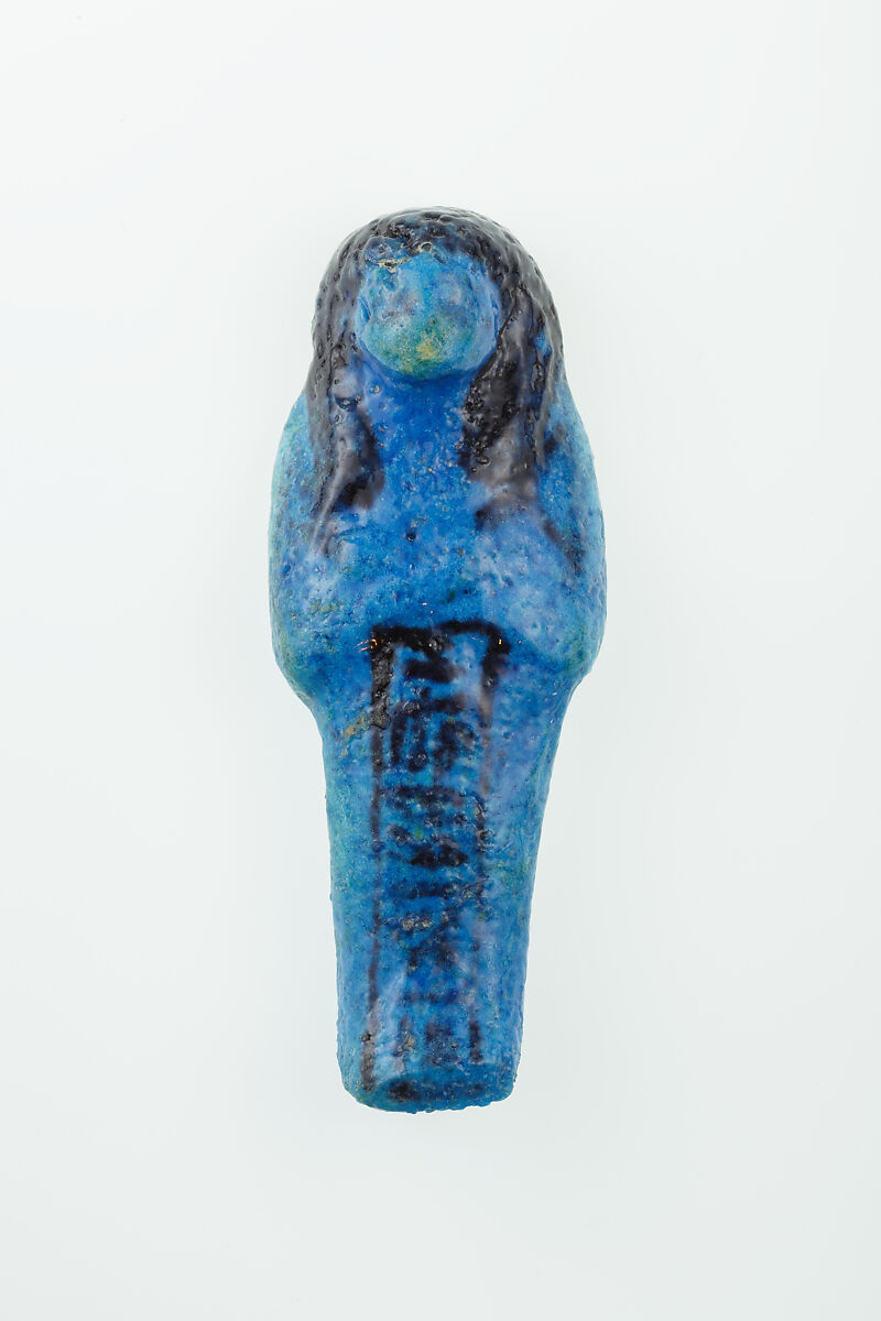 Almost 400 small funerary figures known as shabtis were found with Nauny’s burial. These can be seen as avatars, meant to carry out agricultural labor on Nauny’s behalf in the afterlife. Of the 393 shabtis discovered, 355 were workers like this one, and 37 were overseers (see for example <a href="https://www.metmuseum.org/art/collection/search/551114">30.3.28.3</a>). Based on other assemblages from this era, Nauny originally might have had a total of 365 workers, one for each day of the year. This mummiform figure holds a hoe in each hand and has a basket on its back. The inscription on the front of the body reads, "the Osiris Nauny, true of voice." This indicated that Nauny had been transformed through the process of mummification and identified with the principal god of the dead, and then had been judged to have led an ethical life. Nauny’s shabtis were divided between seven boxes. Five of these, with their shabtis, were given to The Met, while two were sent to the Egyptian Museum in Cairo.