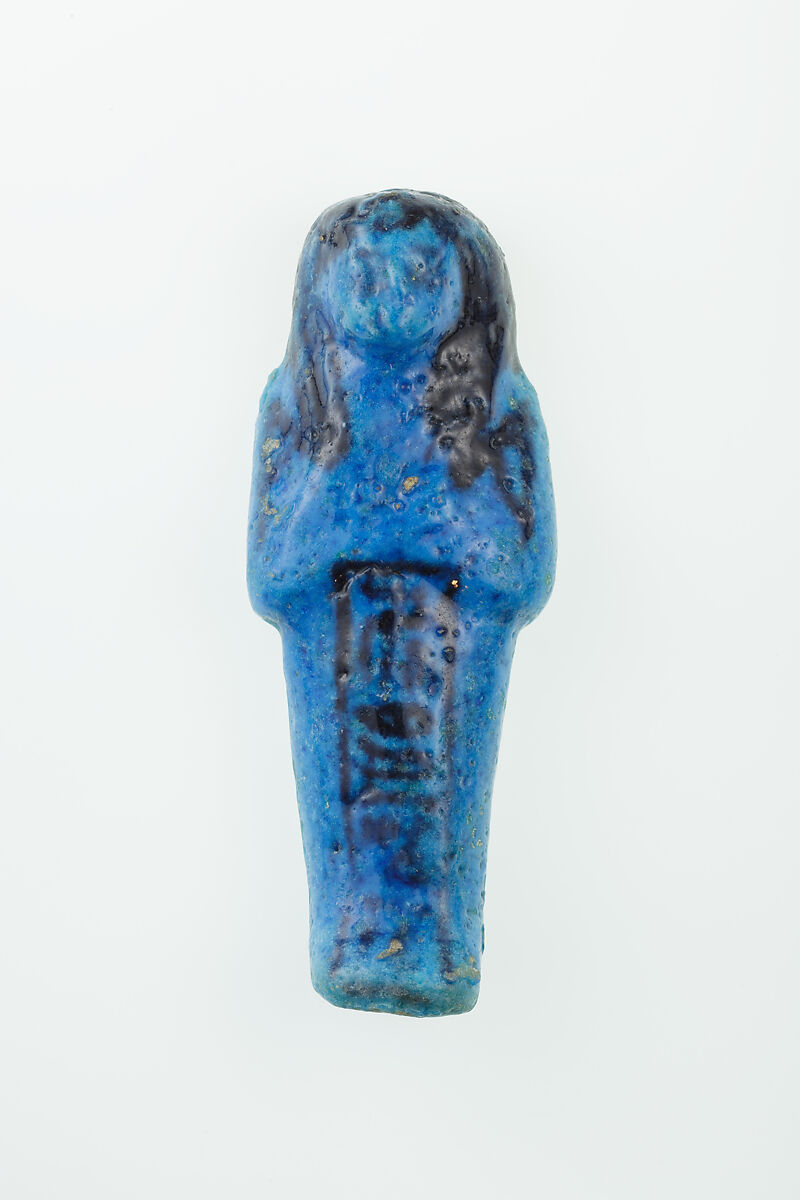 Almost 400 small funerary figures known as shabtis were found with Nauny’s burial. These can be seen as avatars, meant to carry out agricultural labor on Nauny’s behalf in the afterlife. Of the 393 shabtis discovered, 355 were workers like this one, and 37 were overseers (see for example <a href="https://www.metmuseum.org/art/collection/search/551114">30.3.28.3</a>). Based on other assemblages from this era, Nauny originally might have had a total of 365 workers, one for each day of the year. This mummiform figure holds a hoe in each hand and has a basket on its back. The inscription on the front of the body reads, "the Osiris Nauny, true of voice." This indicated that Nauny had been transformed through the process of mummification and identified with the principal god of the dead, and then had been judged to have led an ethical life. Nauny’s shabtis were divided between seven boxes. Five of these, with their shabtis, were given to The Met, while two were sent to the Egyptian Museum in Cairo.