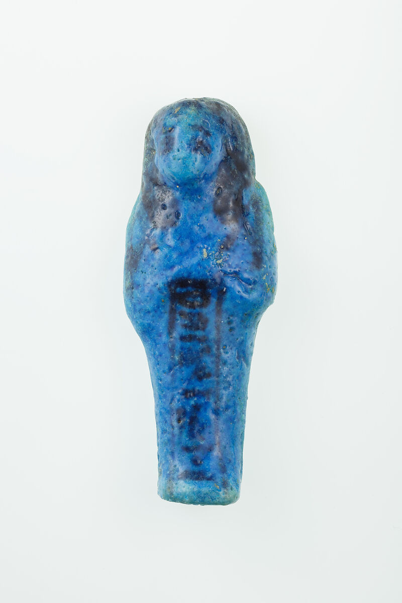 Almost 400 small funerary figures known as shabtis were found with Nauny’s burial. These can be seen as avatars, meant to carry out agricultural labor on Nauny’s behalf in the afterlife. Of the 393 shabtis discovered, 355 were workers like this one, and 37 were overseers (see for example <a href="https://www.metmuseum.org/art/collection/search/551114">30.3.28.3</a>). Based on other assemblages from this era, Nauny originally might have had a total of 365 workers, one for each day of the year. This mummiform figure holds a hoe in each hand and has a basket on its back. The inscription on the front of the body reads, "the Osiris Nauny, true of voice." This indicated that Nauny had been transformed through the process of mummification and identified with the principal god of the dead, and then had been judged to have led an ethical life. Nauny’s shabtis were divided between seven boxes. Five of these, with their shabtis, were given to The Met, while two were sent to the Egyptian Museum in Cairo.