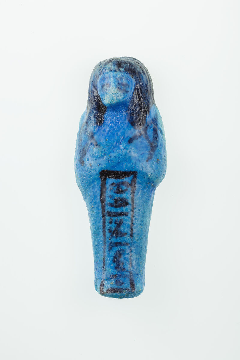 Almost 400 small funerary figures known as shabtis were found with Nauny’s burial. These can be seen as avatars, meant to carry out agricultural labor on Nauny’s behalf in the afterlife. Of the 393 shabtis discovered, 355 were workers like this one, and 37 were overseers (see for example <a href="https://www.metmuseum.org/art/collection/search/551114">30.3.28.3</a>). Based on other assemblages from this era, Nauny originally might have had a total of 365 workers, one for each day of the year. This mummiform figure holds a hoe in each hand and has a basket on its back. The inscription on the front of the body reads, "the Osiris Nauny, true of voice." This indicated that Nauny had been transformed through the process of mummification and identified with the principal god of the dead, and then had been judged to have led an ethical life. Nauny’s shabtis were divided between seven boxes. Five of these, with their shabtis, were given to The Met, while two were sent to the Egyptian Museum in Cairo.