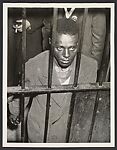 The presence of prison bars dominates this press photograph of a recently booked inmate. Major Green, a porter, confessed to the murder of Mrs. Mary Robinson Case, who was found strangled in the bathtub of her New York apartment.