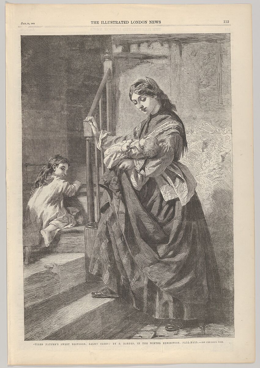Thomas's skilled wood engraving appeared in the popular London weekly, the "Illustrated London News." The tender image shows a mother cradling a sleeping baby, about to take the child upstairs to bed, preceded by a young daughter. Barnes produced genre subjects, generally centered on a few figures. His painting was exhibited at the British Institution, London in 1863. That same year, the charming composition was also translated into a large mixed method print by Charles Algernon Tomkins titled "Bed Time."