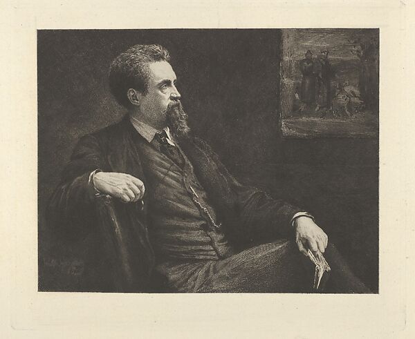 Damman's etching reproduces a portrait of the artist (Walker Art Gallery, Liverpool) by Ouless that was shown at the Royal Academy, London in 1875 and also at Liverpool's Autumn Exhibition the same year. The related print was published in 1880 in "The Portfolio" and exhibited at the Dudley Gallery, London and the Paris Salon.