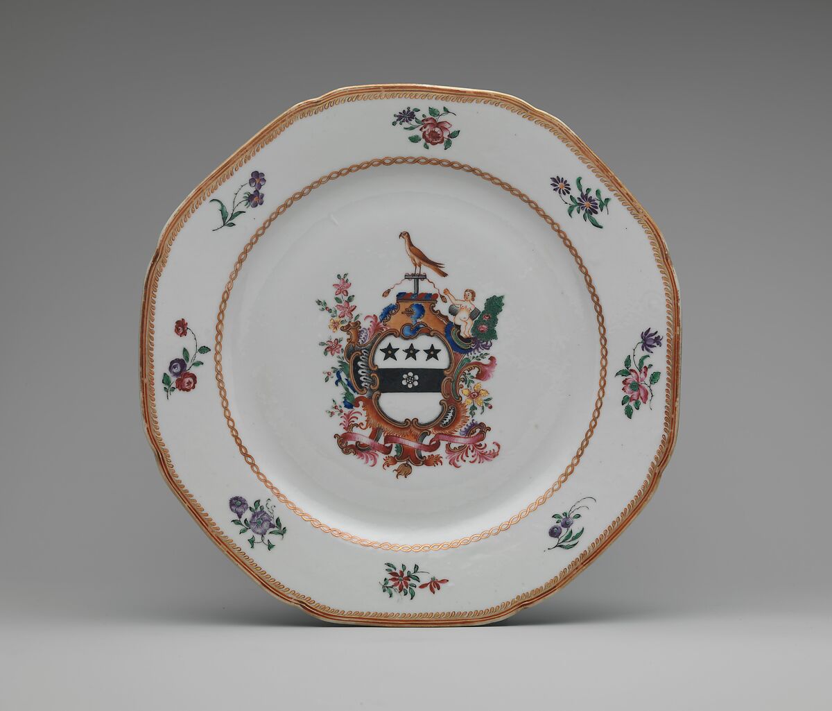 This object belongs to a large dinner service (10.149.1–.248) bearing the Townley family coat-of-arms. The service, probably ordered by Justice Samuel Chase (1741–1811) of Annapolis, Maryland, displays the enamel-painted arms of Margaret Townley, Chase's aunt.