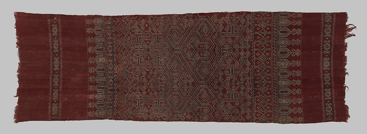 This ceremonial textile (pua sungkit) from the Iban people of northern Borneo is adorned with geometric motifs executed in supplementary weft. The central field is dominated by three large S-shaped motifs surrounded by angular tendril-like forms, all rendered in light blue and white. The central field is bounded above and below by a row of repeating peaked forms in blue and white, which alternate between forms with plain red centers and forms infilled with white with small diamond shaped motifs. The central field is bordered above and below by a broad plain red border decorated with a single row of diamond shaped motifs, each with four projecting tendril like forms which is situated roughly midway between the central field and the upper and lower edges.