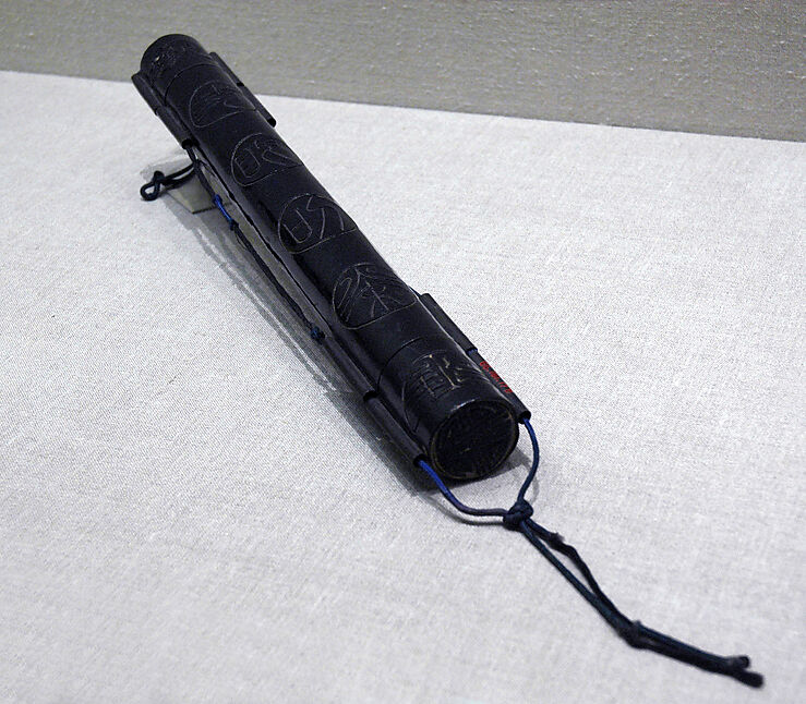 This elaborate, tubular lacquered box was intended as a storage container for an official's hat feather. The large, encircled characters in archaic style on one side of the container refer to "three eyes"—a hat feather with three peacock-feather eyes, which signified the highest honor. The work is an example of the Qing period's enthusiasm for archaism.
