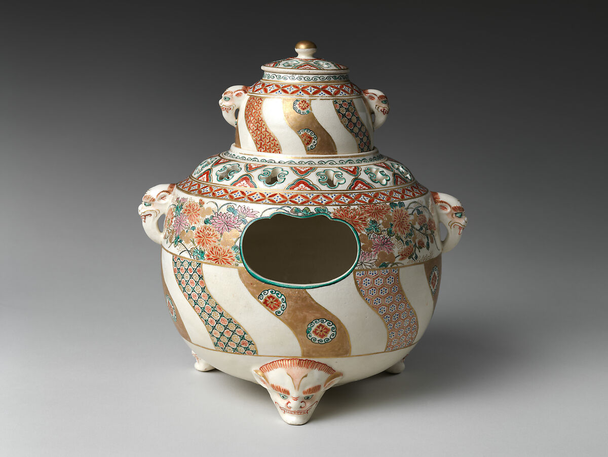 - Medium: Stoneware with polychrome enamels and gold over finely crackled glaze (Satsuma ware)