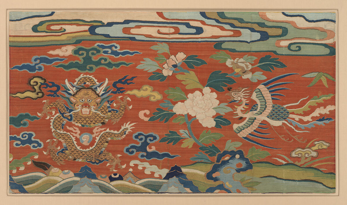 This vivid silk tapestry, lavishly embellished with gold thread, depicts a coiling dragon rising through clouds above mountains and waves. A colorful phoenix flies over blooming peonies, a garden rock, and a magic mushroom—all symbols of an age of peace and prosperity.
