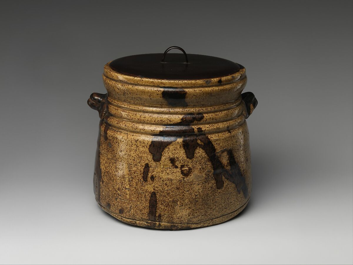 - Medium: Clay covered with glaze and iron-brown splashes; black lacquer cover (Ki [yellow] Seto ware)