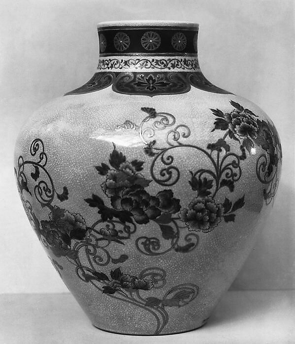 - Medium: Faience with crackled glaze; decoration in colored enamels and gold (Satsuma ware)