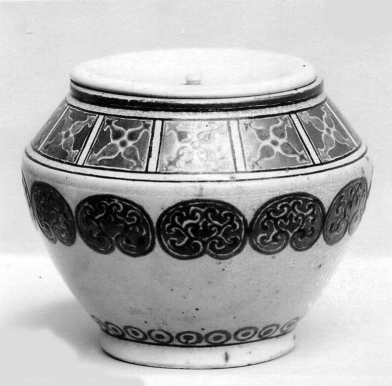 - Medium: Pottery decorated with colored enamels and gold on a finely crackled ground; ivory lid (Satsuma ware)