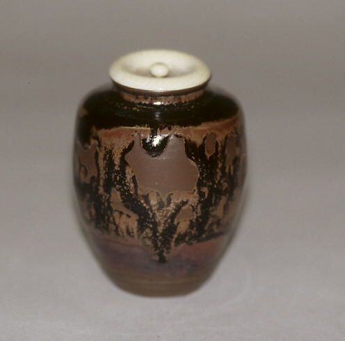 - Medium: Clay, underglaze with large areas of dark brown overglaze, showing slight iridescence (Takatori ware)
