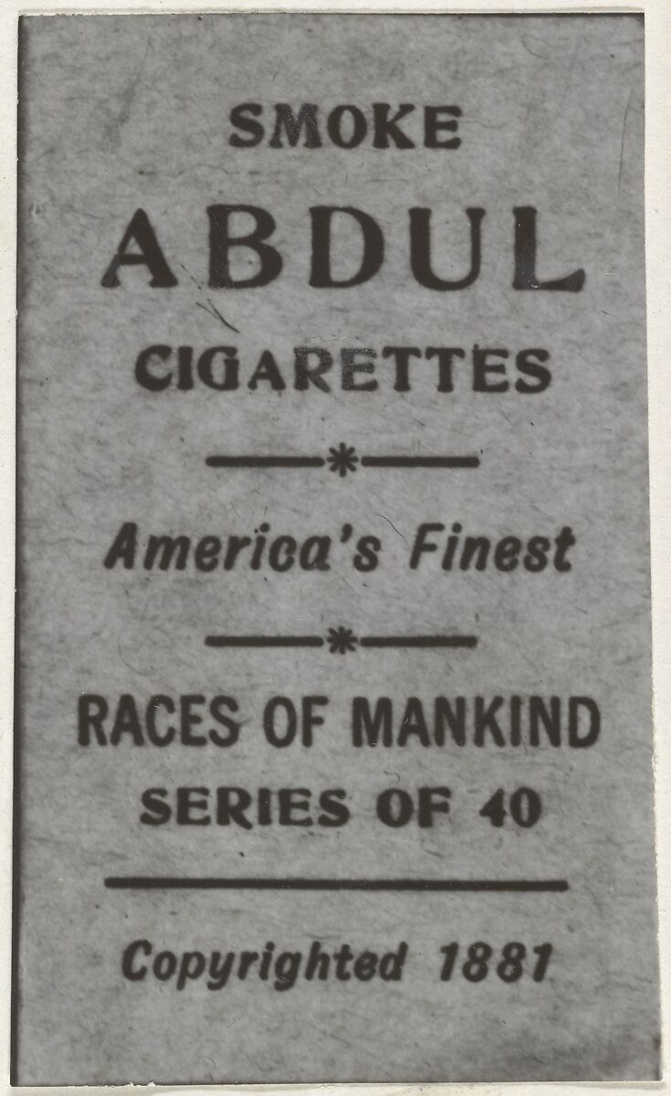 - Title:Facsimile of card verso from the Races of Mankind series (T181) issued by Abdul Cigarettes