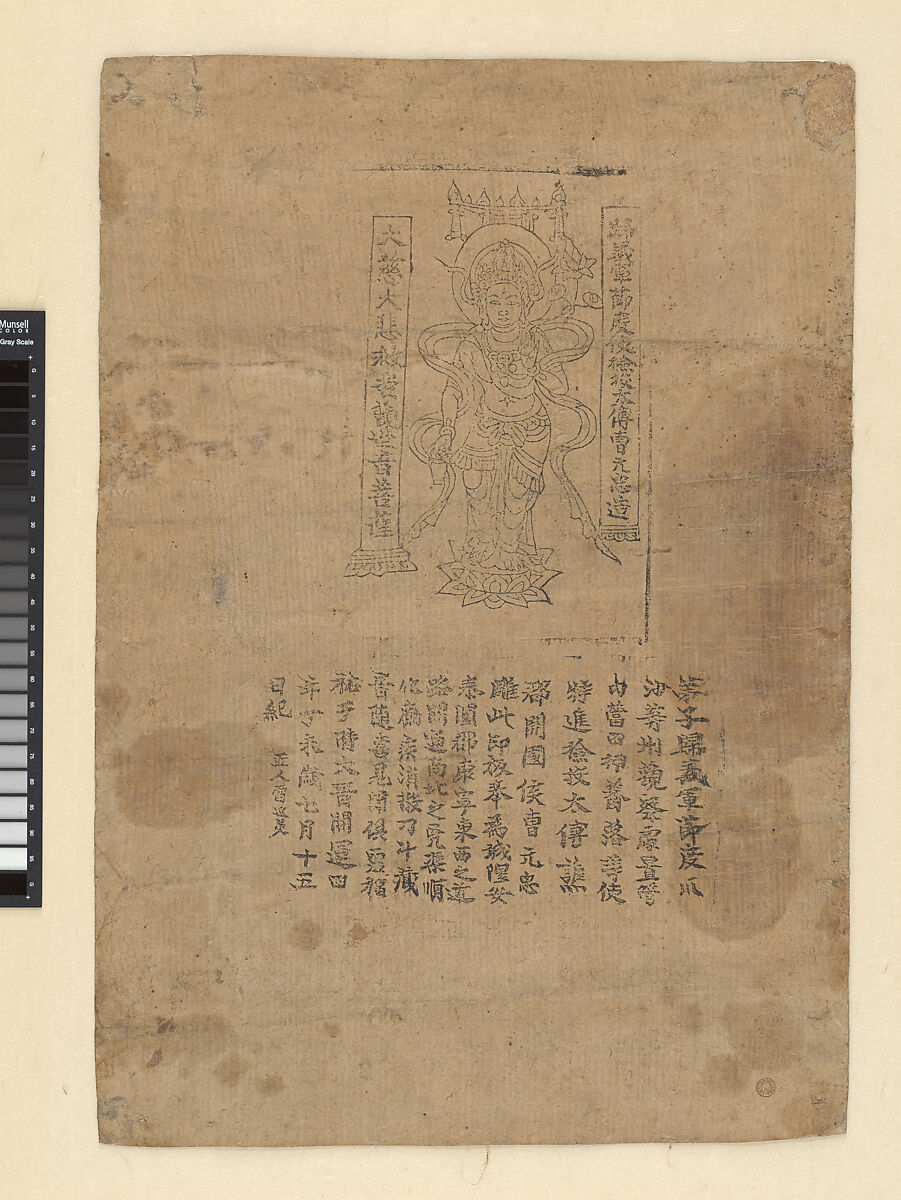 This humble image of Guanyin is a rare survival from the early days of printing in China. It was commissioned by Cao Yuanzhong, ruler of Dunhuang, the oasis town in western China that was the final stopping point for Silk Road travelers before the arid horrors of the Taklamakan desert. This print was one of many Buddhist artworks commissioned by Cao to aid travelers to and from Dunhuang. The text, which identifies Guanyin as “Greatly Merciful, Greatly Compassionate Rescuer from Suffering,” calls upon the deity to bring an end to war and disease and to watch over the highways in and out of the oasis.