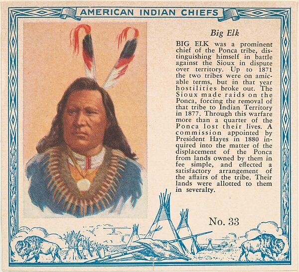 Card No. 33, Big Elk, from the Indian Chiefs series (T129) issued by Red Man Chewing Tobacco