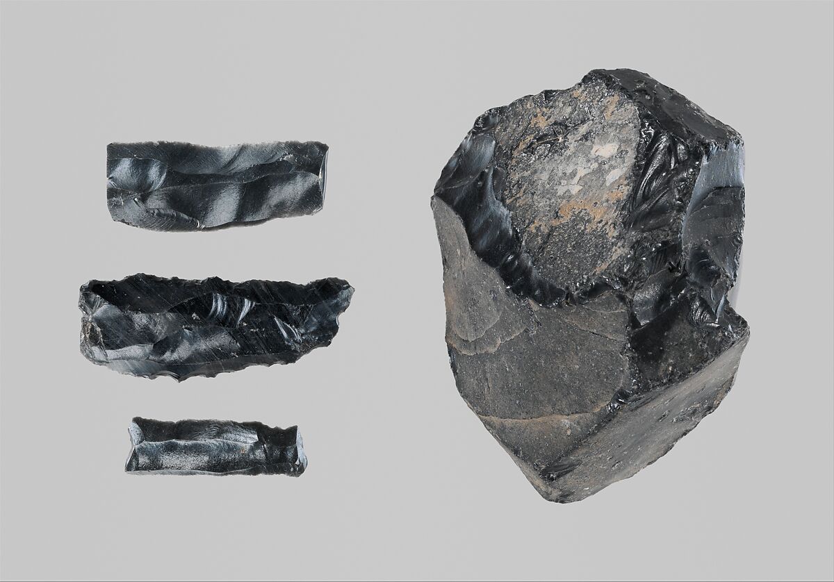 Obsidian is a natural glass. The lump of obsidian is just that. The three blades are all flat at the bottom and rise to a more or less broad ridge at the top.