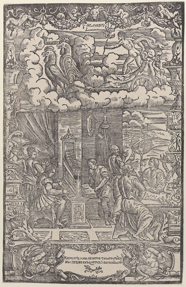 - Title: In upper section Mercury in a chariot drawn by two cocks, below musicians and astronomers, from 'The Seven Planets'