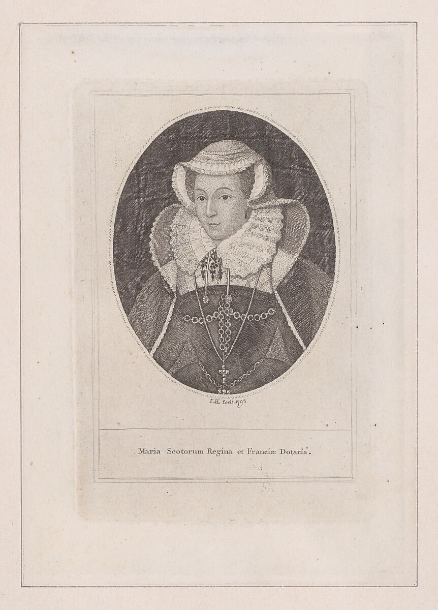 Kay sometimes made etchings of important historical figures, as well as portraying his Edinburgh contemporaries. Here he based a half-length image of Scotland's most famous queen on an engraving by George Vertue, the latter in turn relying on a sixteenth-century painting by Nicholas Hillard. Mary Stuart is shown half-length within an oval, wearing a dark gown with a ruff, gauzy cape, gable headdress, and a cross hanging at her front. The print was used to illustrate a later edition of William Robertson's "The History of Scotland during the reign of Queen Mary and King James VI till his accession to the Crown of England" (first published 1759); see 17.3.756-1112 for another impression and 58.549.167 for a variant.
