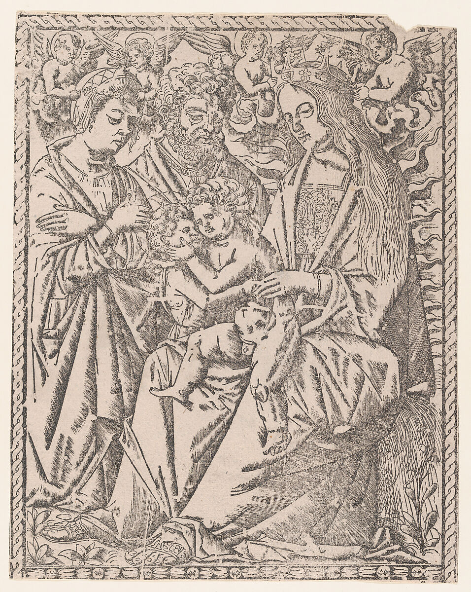 - Title: Saint John the Baptist embracing the Christ Child who sits on the Virgin's knee, she is being crowned by angels, other saints at left