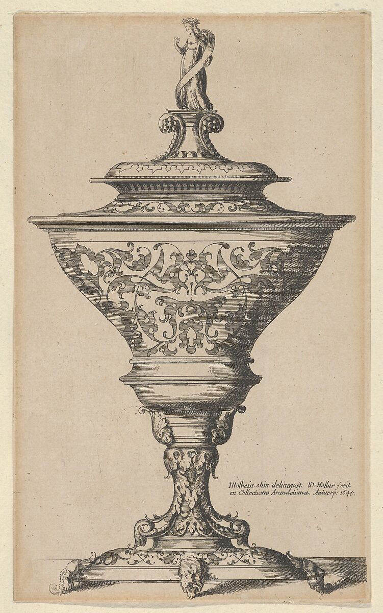 Ornate engraved goblet with masks of satyrs as feet, featuring a female figure on the finial of the lid, standing to left, surrounded by a scroll; after Hans Holbein