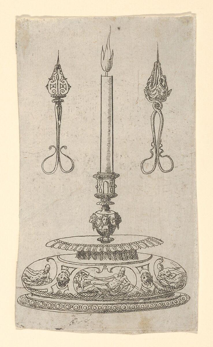 Print with a design for a candlestick decorated with reclining gods in oval compartments. On both sides of the burning candle, Hornick has depicted designs for wick trimmers.