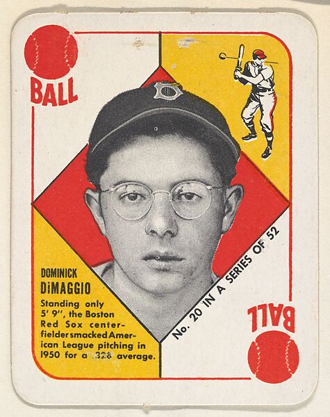 - Title:Card Number 20, Dominick DeMaggio, Outfield, Boston Red Sox, from the Topps Red/ Blue Backs series (R414-5) issued by Topps Chewing Gum Company