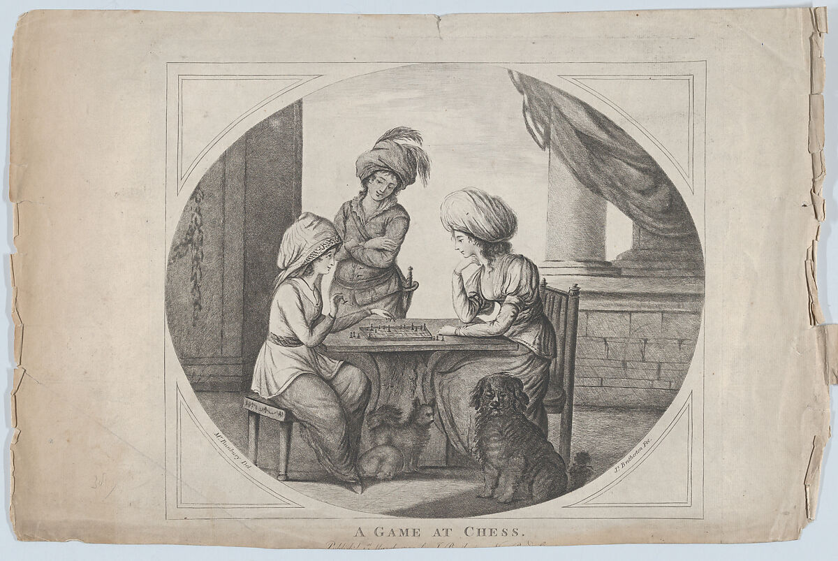 Within an oval, two women play chess at a square table, their game watched by a young man. All three wear turbans, and they are accompanied by three dogs, with pillars and drapery framing the figures.