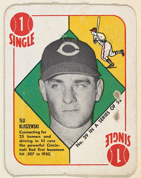 - Title:Card Number 39, Ted Kluszewski, 1st Base, Cincinnati Reds, from the Topps Red/ Blue Backs series (R414-5) issued by Topps Chewing Gum Company