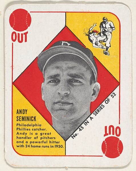 - Title: Card Number 45, Andy Seminick, Catcher, Philadelphia Phillies, from the Topps Red/ Blue Backs series (R414-5) issued by Topps Chewing Gum Company