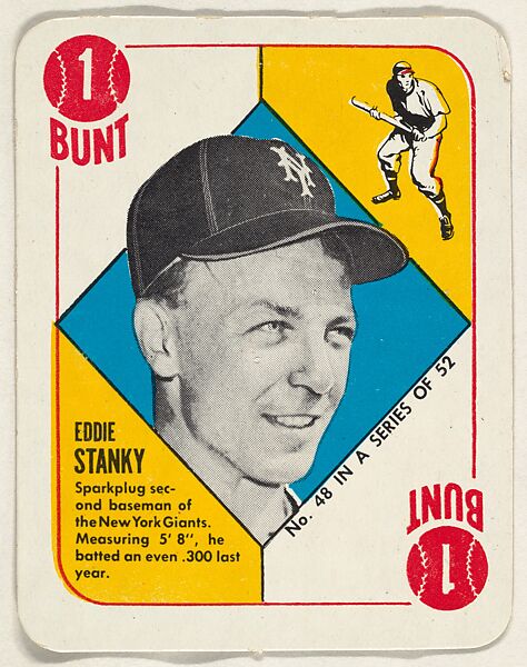 - Title: Card Number 48, Eddie Stanky, 2nd Base, New York Giants, from the Topps Red/ Blue Backs series (R414-5) issued by Topps Chewing Gum Company