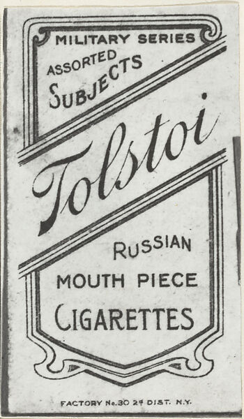 - Title:Facsimile of Verso to Promote Tolstoi Cigarettes, from the Military series (T80) issued by the American Tobacco Company