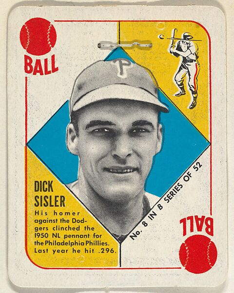 - Title:Card Number 8, Dick Sisler, Philadelphia Phillies, from the Topps Red/ Blue Backs series (R414-5) issued by Topps Chewing Gum Company