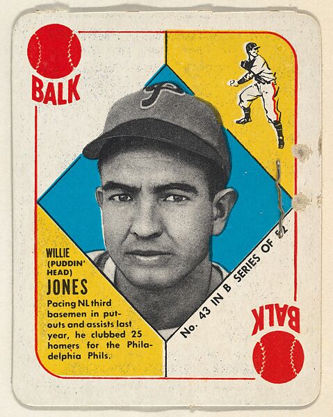 - Title:Card Number 43, Willie "Puddin' Head" Jones, 3rd Base, Philadelphia Phillies, from the Topps Red/ Blue Backs series (R414-5) issued by Topps Chewing Gum Company