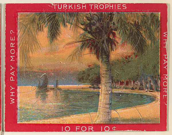 Trade card from the "Jig Saw Puzzle Pictures" series (T76), issued 1909-11 to promote Turkish Trophies Cigarettes. Each card is comprised of multiple jigsaw puzzle pieces affixed to the original album page. Cards in the set feature either red or blue borders.