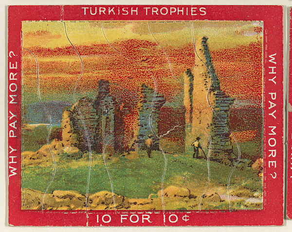 Trade card from the "Jig Saw Puzzle Pictures" series (T76), issued 1909-11 to promote Turkish Trophies Cigarettes. Each card is comprised of multiple jigsaw puzzle pieces affixed to the original album page. Cards in the set feature either red or blue borders.