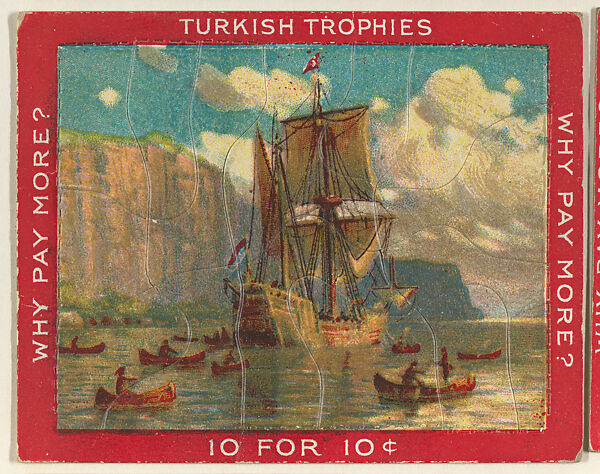 Trade card from the "Jig Saw Puzzle Pictures" series (T76), issued 1909-11 to promote Turkish Trophies Cigarettes. Each card is comprised of multiple jigsaw puzzle pieces affixed to the original album page. Cards in the set feature either red or blue borders.