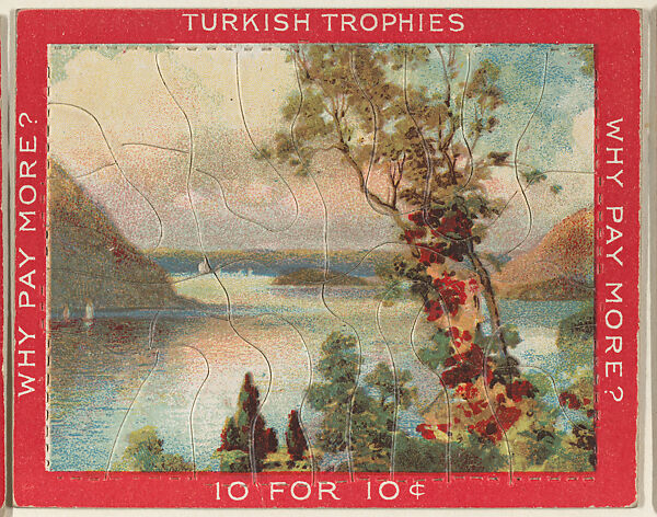 Trade card from the "Jig Saw Puzzle Pictures" series (T76), issued 1909-11 to promote Turkish Trophies Cigarettes. Each card is comprised of multiple jigsaw puzzle pieces affixed to the original album page. Cards in the set feature either red or blue borders.