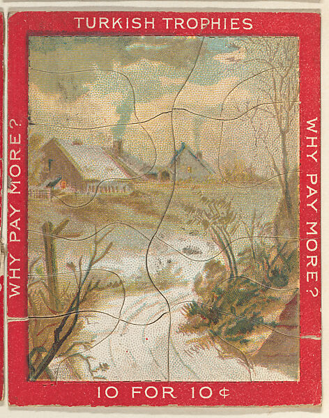 Trade card from the "Jig Saw Puzzle Pictures" series (T76), issued 1909-11 to promote Turkish Trophies Cigarettes. Each card is comprised of multiple jigsaw puzzle pieces affixed to the original album page. Cards in the set feature either red or blue borders.