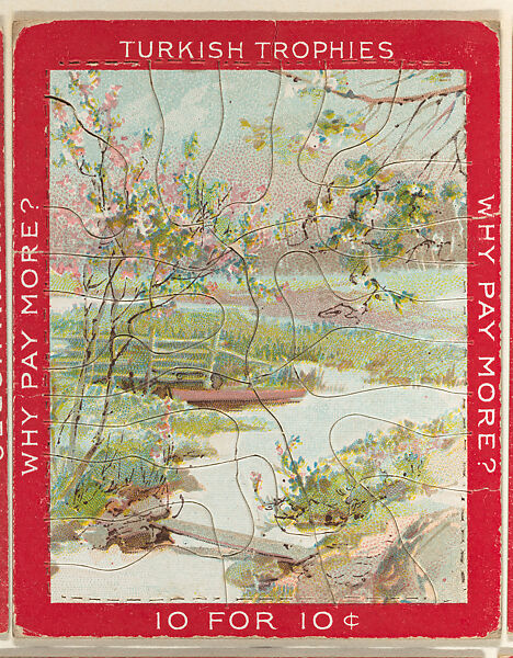 Trade card from the "Jig Saw Puzzle Pictures" series (T76), issued 1909-11 to promote Turkish Trophies Cigarettes. Each card is comprised of multiple jigsaw puzzle pieces affixed to the original album page. Cards in the set feature either red or blue borders.