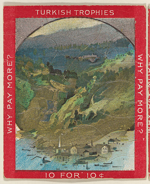 Trade card from the "Jig Saw Puzzle Pictures" series (T76), issued 1909-11 to promote Turkish Trophies Cigarettes. Each card is comprised of multiple jigsaw puzzle pieces affixed to the original album page. Cards in the set feature either red or blue borders.
