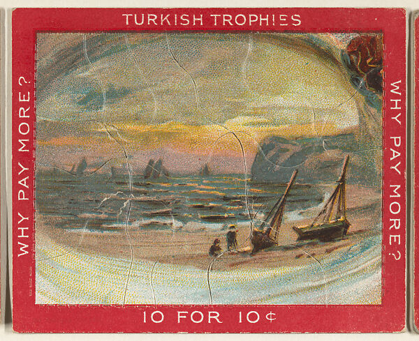 Trade card from the "Jig Saw Puzzle Pictures" series (T76), issued 1909-11 to promote Turkish Trophies Cigarettes. Each card is comprised of multiple jigsaw puzzle pieces affixed to the original album page. Cards in the set feature either red or blue borders.